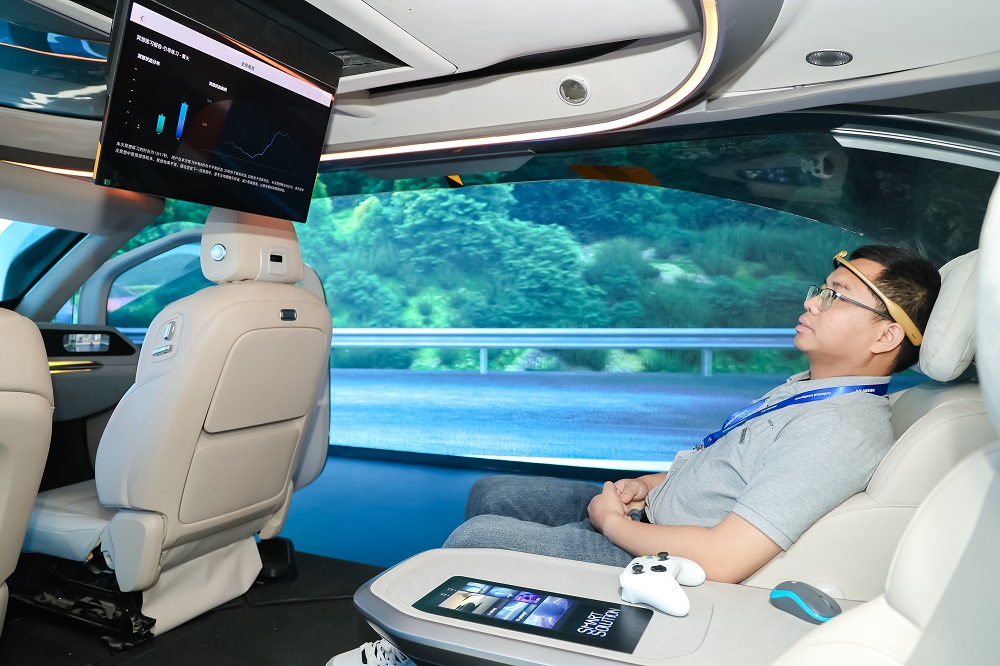 Key features include a head Ring for real-time motion sickness prevention via brain wave monitoring, an in-vehicle high-performance computing platform that runs AAA games smoothly, AI-powered upscaling for optimized video resolution, and an adaptive ambient lighting system with theater-grade immersion.